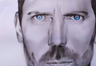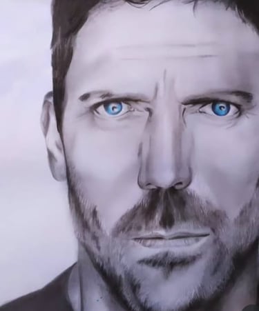 Nesta obra impactante, Sheila Martins captura a essência cética e brilhante do personagem Dr. House. O trabalho de foco seletivo é primoroso: enquanto a barba e os traços faciais mantêm um realismo rústico, o destaque vai para o azul intenso e penetrante dos olhos, que parecem analisar o espectador. É um estudo avançado sobre como usar o contraste e a cor focal para dar vida e personalidade a um retrato em grafite.