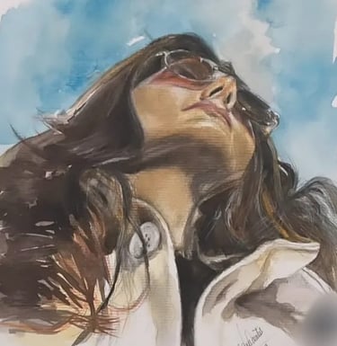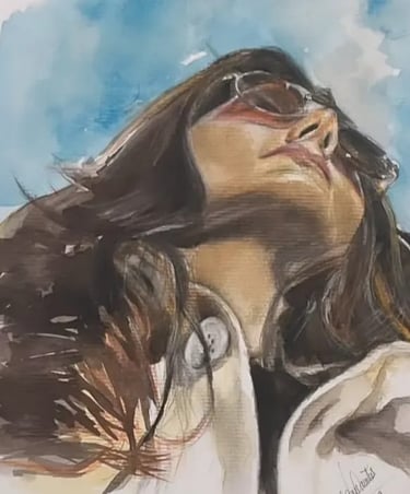 Esta aquarela captura um momento de introspecção e esperança. Através de pinceladas fluidas e uma paleta de azuis celestiais e tons terrosos quentes, a Sheila consegue transmitir a sensação de alguém que olha para o futuro com fé. O domínio da luz no rosto, contrastando com a suavidade do fundo, demonstra como a aquarela pode ser usada para criar atmosferas de profunda paz e serenidade.