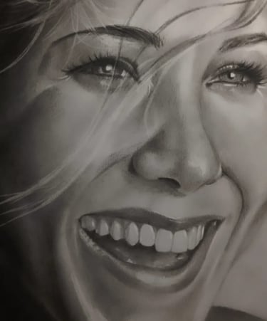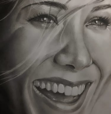 Esta obra é uma aula de domínio técnico sobre a alegria. A Sheila conseguiu capturar não apenas um sorriso, mas a luz que emana dele. Observe a precisão absoluta nos detalhes dos dentes, o brilho úmido nos olhos e as linhas de expressão naturais que dão vida ao rosto. É o exemplo perfeito de como o grafite e o carvão podem deixar de ser apenas pigmento para se tornarem uma fotografia feita à mão.