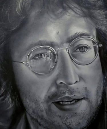Nesta obra, Sheila Martins demonstra por que o realismo é uma forma de imortalidade. Ao retratar John Lennon, a artista domina o uso das luzes e sombras para esculpir os traços icônicos do músico. O destaque absoluto vai para o reflexo nos óculos redondos e a textura suave, porém detalhada, da pele e dos fios de cabelo. É uma peça que exige do observador um olhar atento, capturando não apenas a aparência, mas a aura de paz e introspecção de uma lenda.